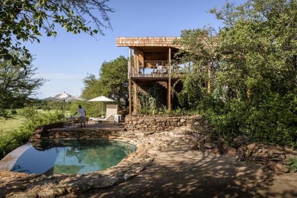 O Singita Faru Faru Lodge permite que seus visitantes apreciem abundante vida selvagem sem sair da suíte. As janelas que vão do chão ao teto dão vista privilegiada para a savana. O lodge combina elegância com a típica rusticidade africana.