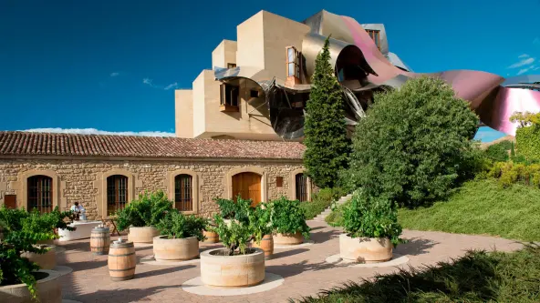 Famoso por obras como o Museu Guggenheim de Bilbao e a Casa Dançante, em Praga. Localizado na Cidade do Vinho, na região de Rioja, este château possui decoração com cores equilibradas, intrigantes curvas na fachada, 43 quartos confortáveis e um serviço totalmente personalizado. Os visitantes podem degustar pratos harmonizados com os melhores vinhos da região no restaurante Marqués de Riscal, estrelado pelo guia Michelin.